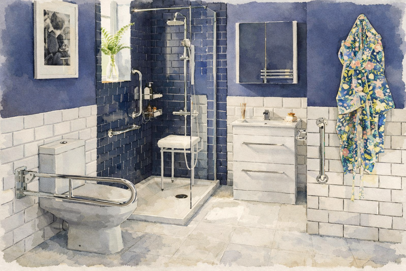 Proper slope, waterproofing, and reinforcement behind walls for support bars are critical elements in accessible bathroom construction. We use advanced waterproofing systems and precise tile installation techniques to ensure long-term durability and safety. Accessibility should feel intentional and cohesive — not clinical.